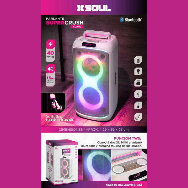 Descubre el Parlante Portátil Soul Super Crush XL1400, un dispositivo diseñado para quienes buscan calidad de sonido y estilo en un formato compacto. Con una potencia de salida de 40 W, este parlante ofrece un audio envolvente que transforma cualquier espacio en una fiesta. Su diseño en torre no solo es atractivo, sino que también optimiza la proyección del sonido. La conectividad Bluetooth permite emparejarlo fácilmente con tus dispositivos, brindándote la libertad de disfrutar de tu música favorita sin cables. Además, cuenta con luces LED que añaden un toque vibrante a tus reuniones, creando un ambiente festivo y dinámico. Su autonomía de 1.5 horas asegura que la diversión no se detenga, ideal para llevarlo a cualquier lugar. Portátil y ligero, el Soul Super Crush XL1400 es perfecto para llevar a la playa, picnics o reuniones al aire libre. Su diseño inalámbrico te permite moverte con libertad mientras disfrutas de un sonido de alta calidad. No dejes pasar la oportunidad de elevar tu experiencia musical con este parlante que combina funcionalidad y estilo.